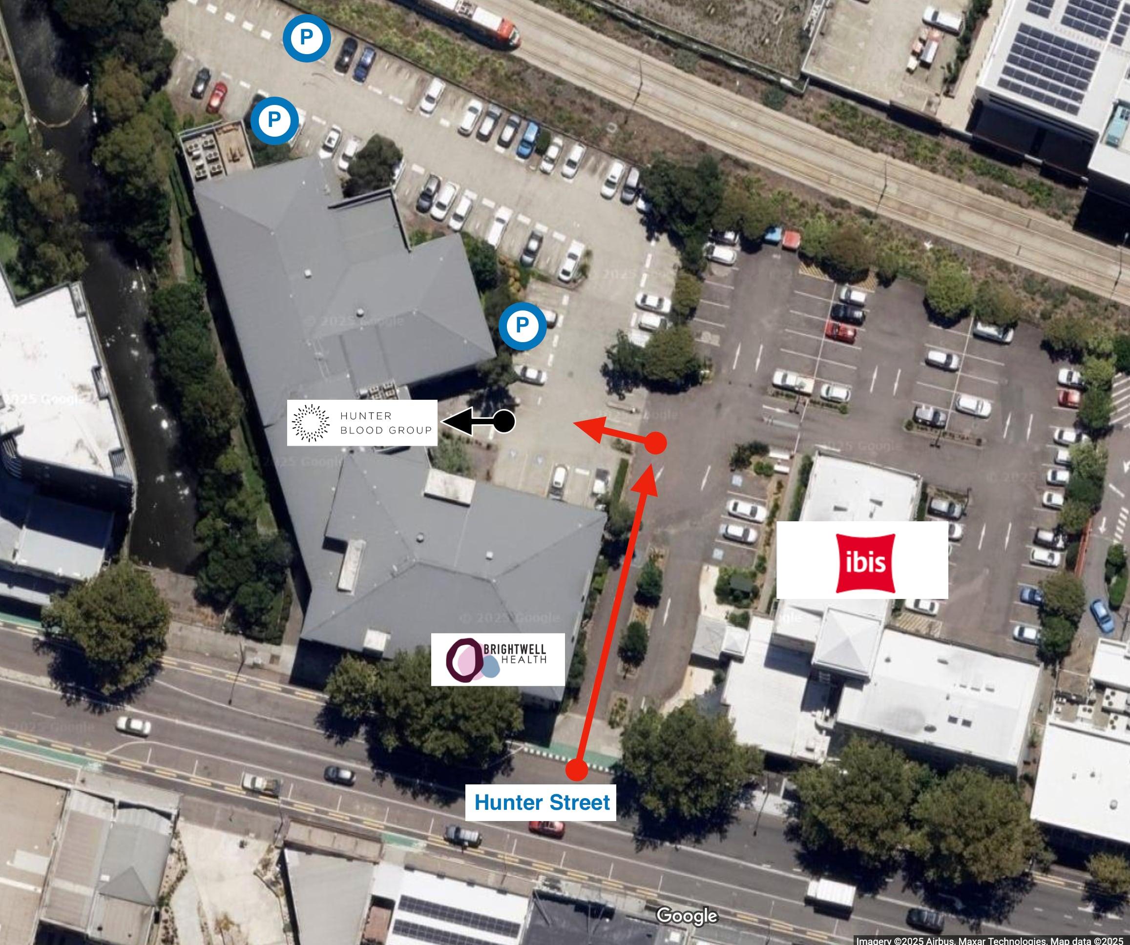 If you are coming from the south, there is NO right turn into Hunter Street. Turn right at King Street, take the second left on to Steel Street, then left on to Hunter Street. You can then turn right into the rooms after the Ibis hotel. In NSW, you are allowed to cross a double unbroken white line when turning into a driveway.